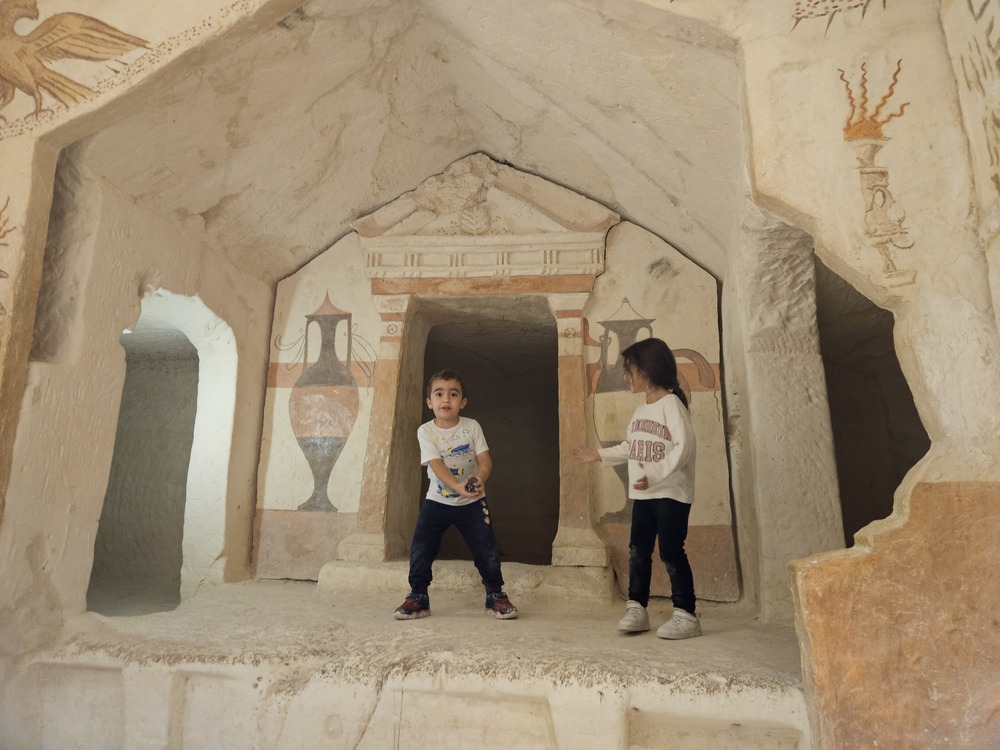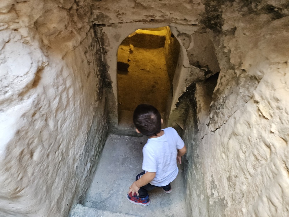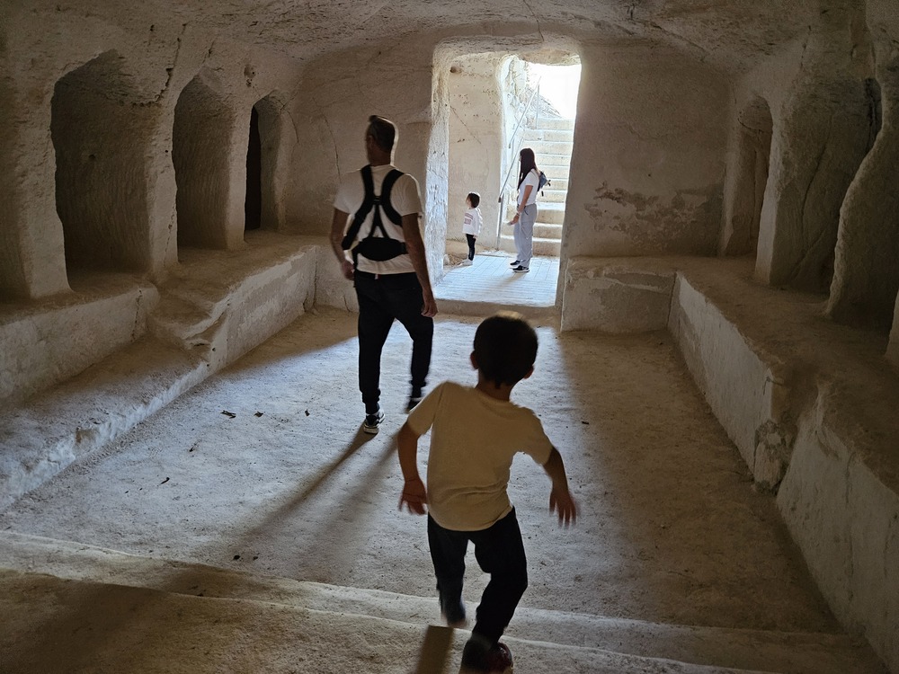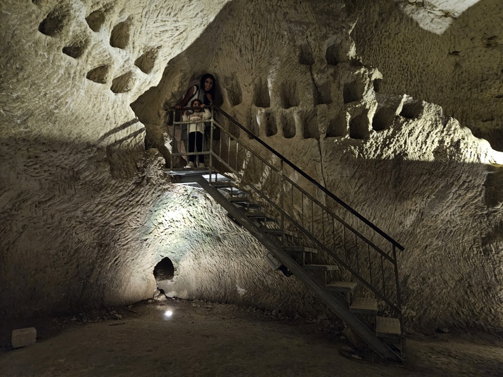 במתחם מערות המשלבות היסטוריה מודרנית ועתיקה. כאלו ששמשו כבור מים, כאלו ששימשו לאחסון, לגידול יונים, לבישול וטבילה, ובית מגורים משוחזר. הילדים נהנים לעבור בין החדרים ולדמיין איך חיו האנשים מתחת לאדמה. הקטנטנים מרגישים אתגר לעלות ולרדת במדרגות שבמנהרה, להקשיב להד של עצמם, לטפס, להכנס פנימה ולצאת ולשחק אחד עם השני ב"מבצר".